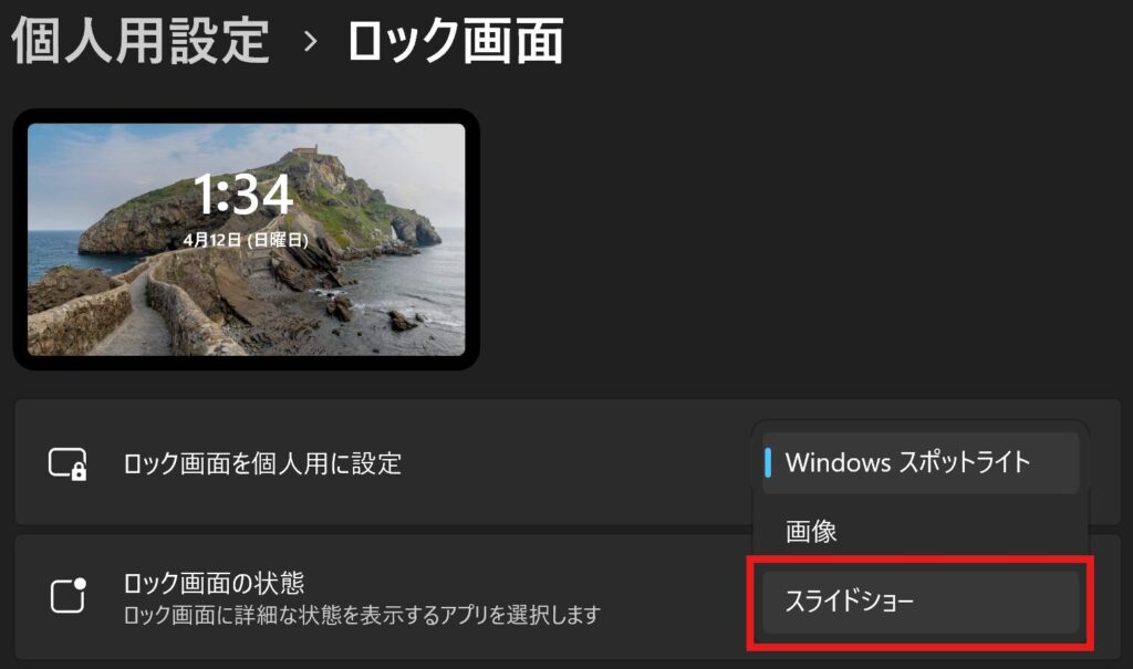 「ロック画面を個人用に設定」の部分が「Windowsスポットライト」になってますので、せめて「スライドショー」に変えちゃいましょう。