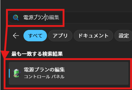 まずはスリープになるまでの時間を変更しましょう。Windowsキーを押して「電源プラン」と入力し、Enterで開きます。