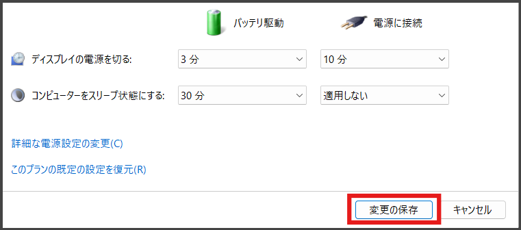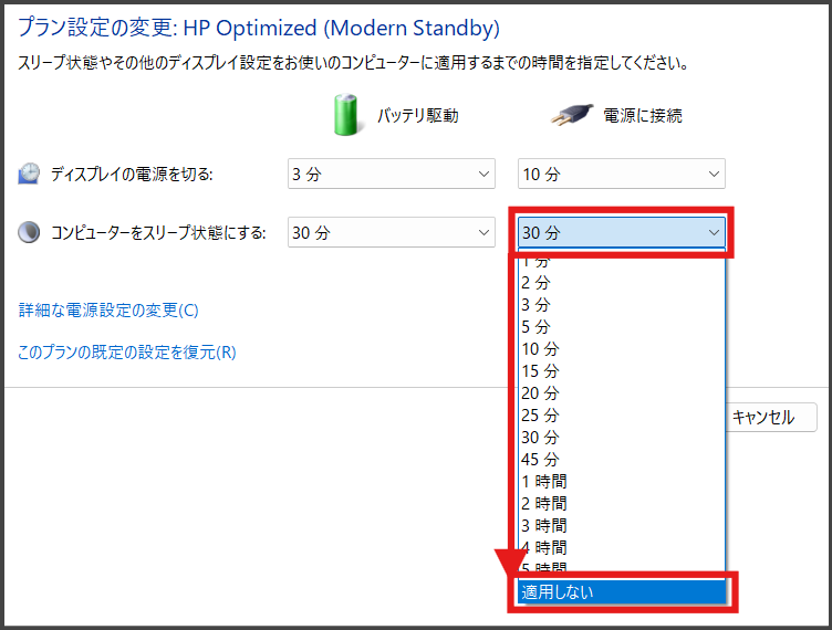 「コンピューターをスリープ状態にする」のプルダウンを、「適用しない」 に変更します。基本的には「電源に接続」のみを変更しておくことを推奨します!「バッテリー駆動」時は充電されていないので、後述の「カバーを閉じても何もしない」設定にした場合に、いつの間にかバッテリーが尽きてしまいますので・・・