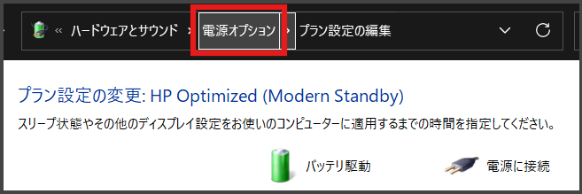 さっきの「電源プランの編集」画面の上部にある 「電源オプション」 をクリックしましょう。