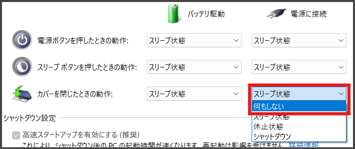 「カバーを閉じたときの動作」のプルダウンが「スリープ状態」になっているので、これを 「何もしない」 に変更します。