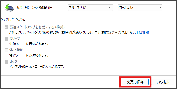 続いて、カバーを閉じたときの動作を変更します。こちらが今回の本題ですね。
