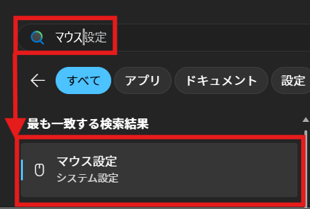 Windowsキーを押して「マウス」と入力し、Enterで開きましょう。