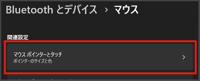さっきの「マウス」設定画面を下にスクロールして、「マウス ポインターとタッチ」を開きます。