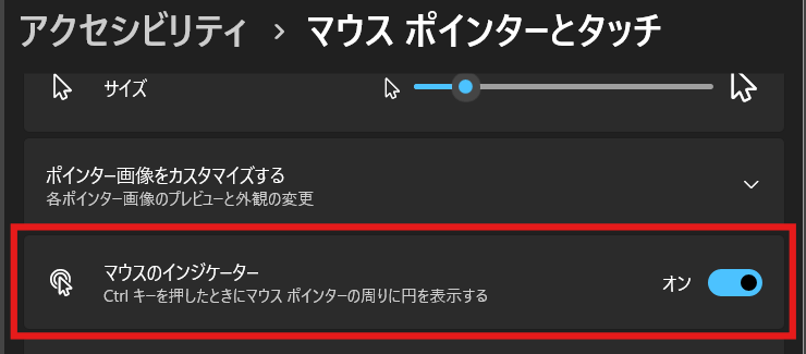 設定箇所は「マウス ポインターとタッチ」の画面内、「マウスのインジケーター」をオンにするだけです。