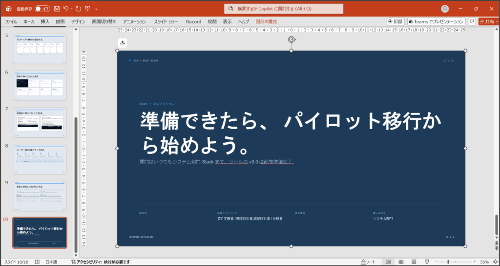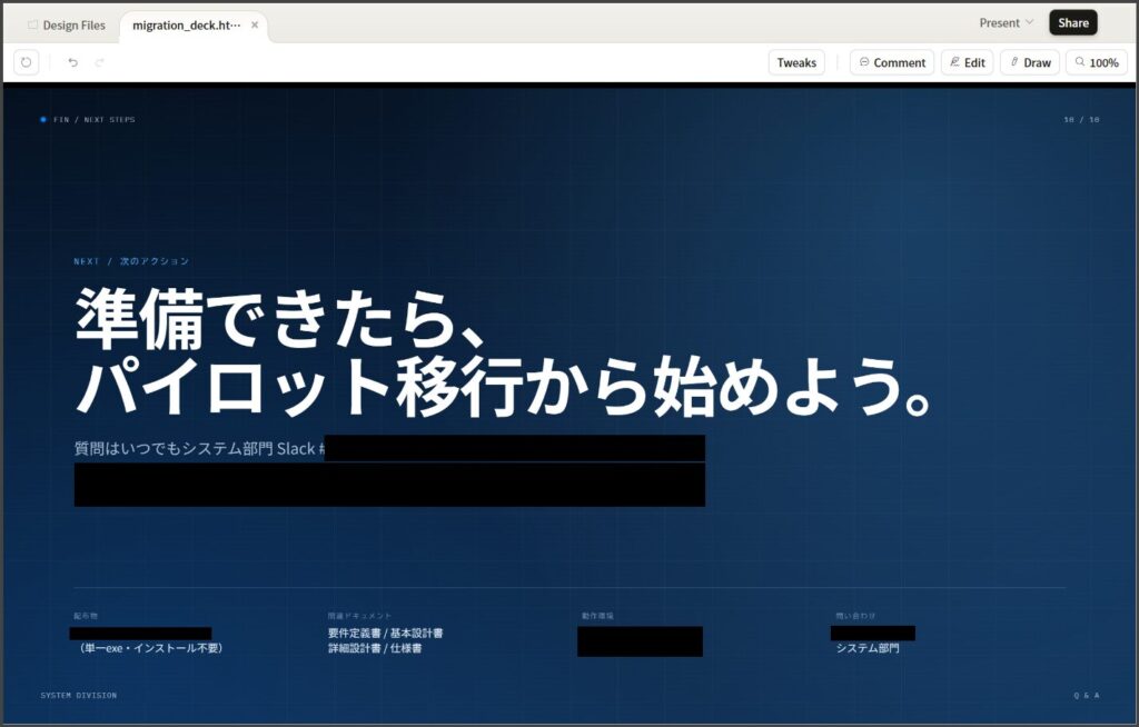 ※実際のプロジェクトのスライドを作ってもらうので色々隠してます。