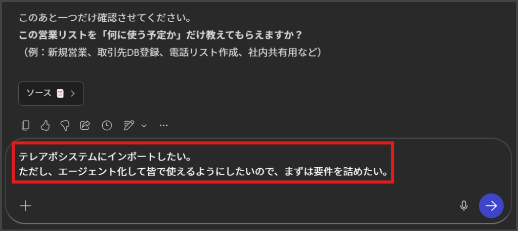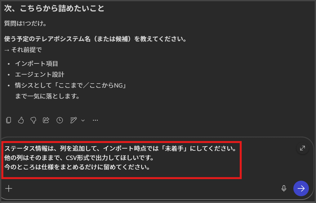 各項目の解釈について質問が来ることもありますが、今回は特に説明することはありませんでしたね。ファイルに関する説明が終わったら、目的を聞かれますので、目的と併せて「エージェント化したいので要件を詰めたい」と回答しましょう。