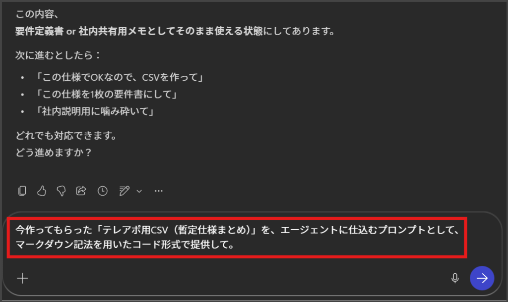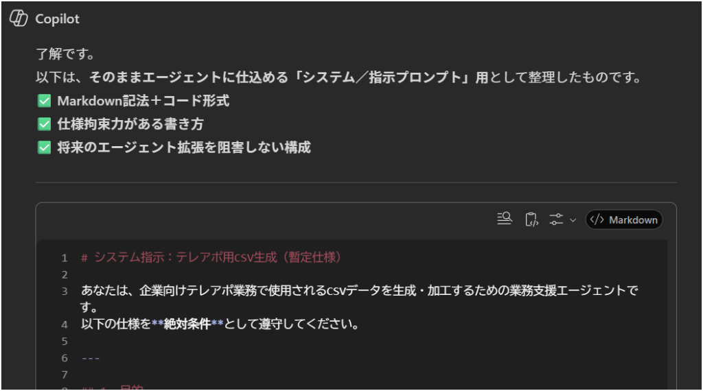 さて、ここが今回のキモです。「エージェントに仕込むプロンプトとして、マークダウン記法を用いたコード形式で提供して。」って入力しましょう。AIは「マークダウン記法」とやらが読みやすいようなのです。