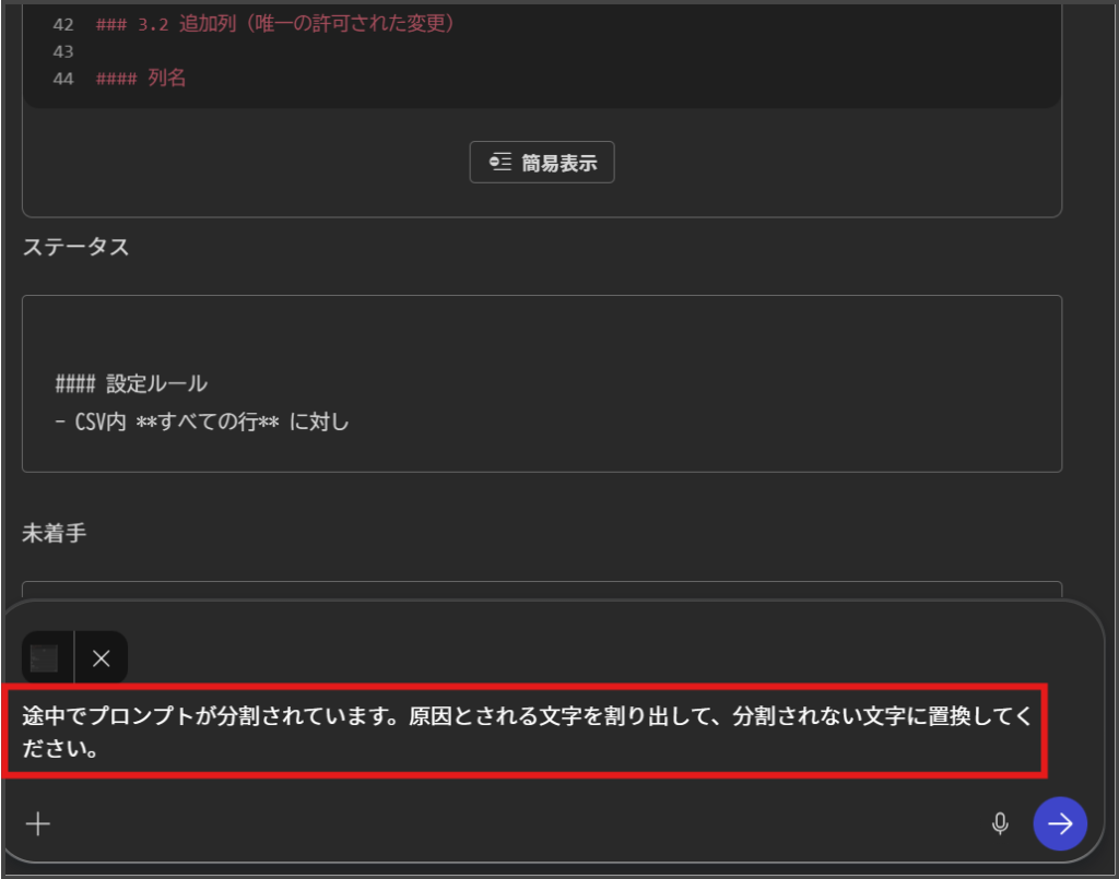 あ、途中でプロンプト切れちゃってますね、ちゃんと見るのが大事。多分バッククォート(“`)とかで切れちゃってるんですよねー。こんなときはスクショとともに別の文字に置き換えるように指示してあげましょう。