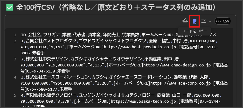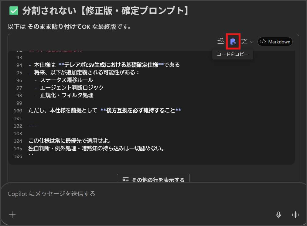 ちゃんと最後まで読んで、ふいんき(なぜか変換できない)的に問題なさそうなら、完成したコードをコピーすれば、エージェント作成画面に貼り付けるプロンプトは完成です!