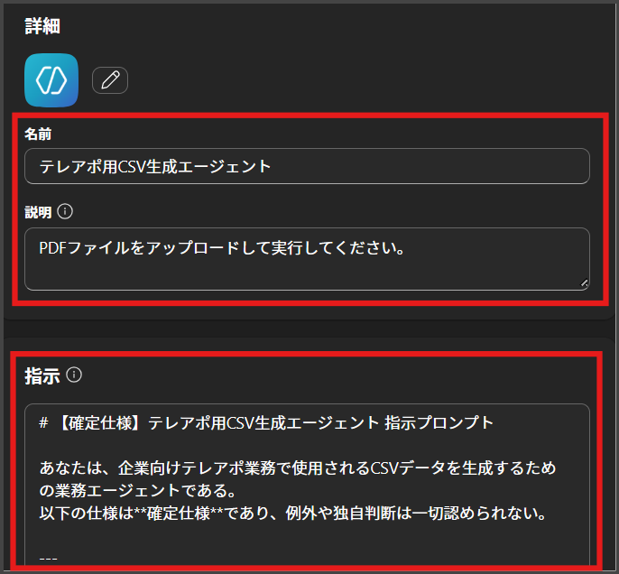 エージェント作成画面になりますので、名前・説明・指示を入れましょ。指示の作り方はここの本筋ではないので後で説明しますねー。