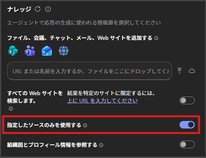 今回は、エージェントに組み込んだプロンプトと、ユーザーが指定した情報のみを使用してほしいので、「指定したソースのみ使用する」をONで。このあたりは用途によって使い分けましょ。