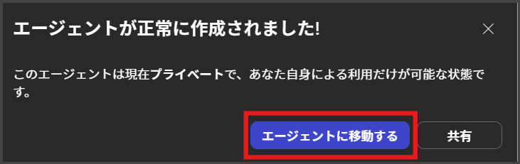 作成されたようですね。まずは「エージェントに移動する」をクリックして、自分で使ってテストしてみましょう!