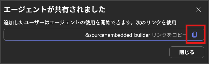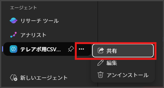 作成したエージェントにカーソルを合わせ、「…」>「共有」をクリックします。