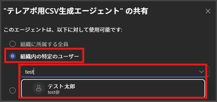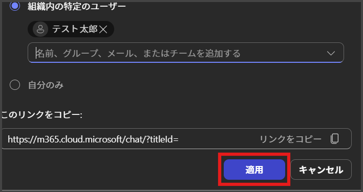 組織全体に公開すると、変なチャチャを入れてくる人が現れるので、「組織内の特定のユーザー」にしてユーザーを指定ましょう。