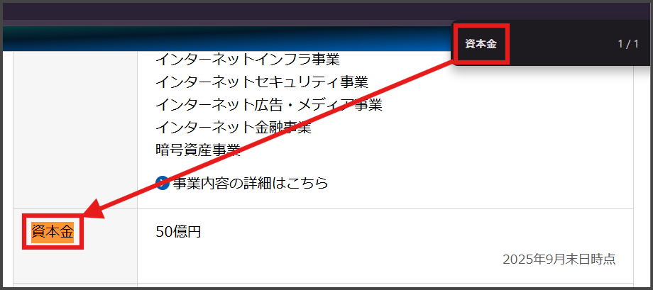 会社概要のページに辿り着きました。資本金を探すべくCtrl+F!