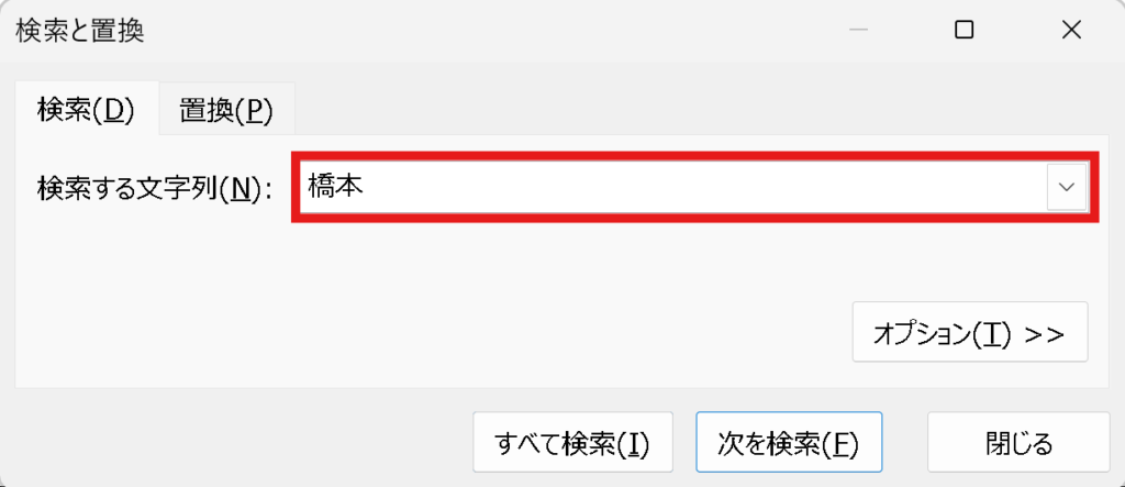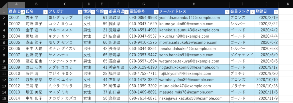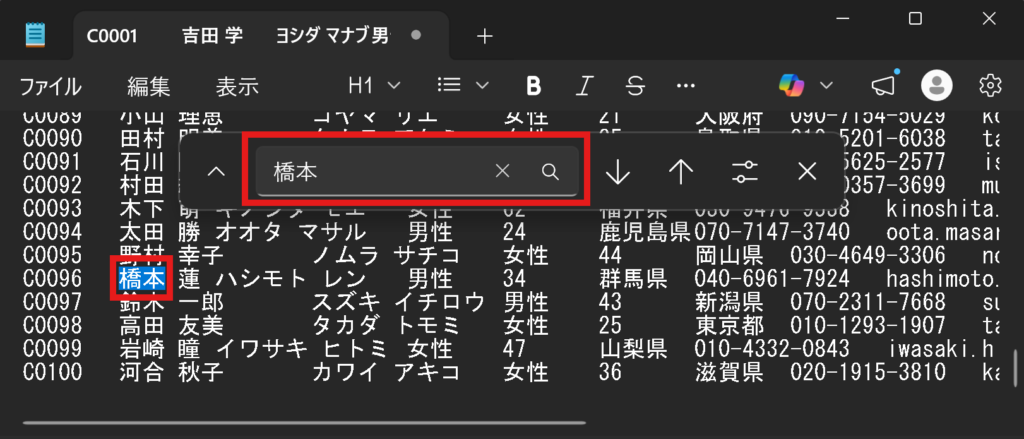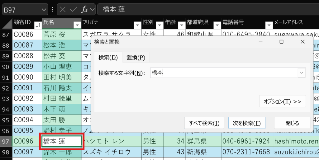 ここではExcelで作成したダミーの顧客リストで「橋本」さんを探してみましょう。